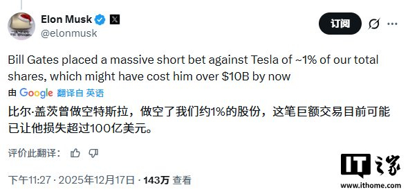 IT之家 12 月 18 日消息,伊隆・马斯克就比尔・盖茨做空特斯拉一事再次向这位微软前首席执行官发难,多年来二人已因此事产生不少矛盾。