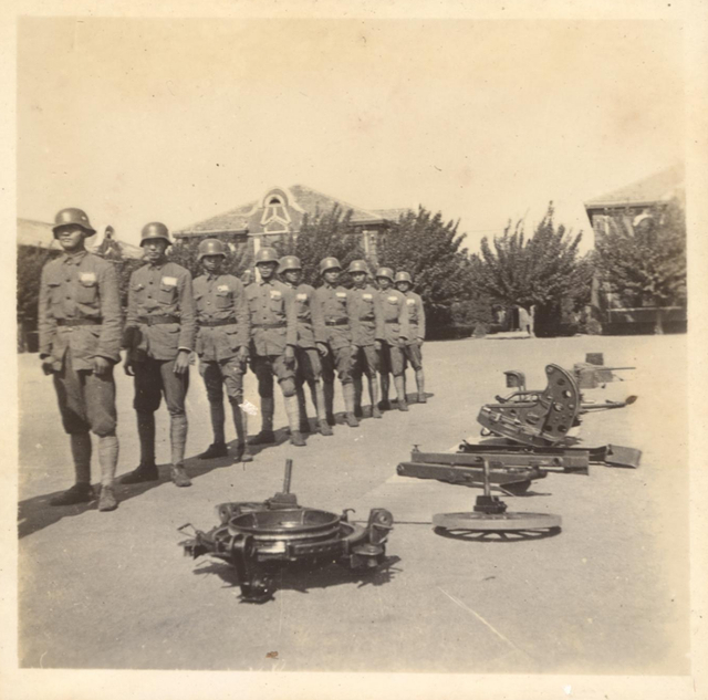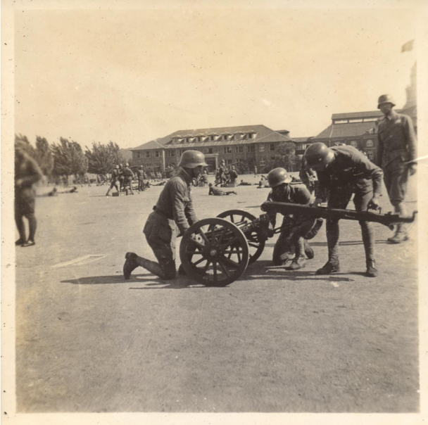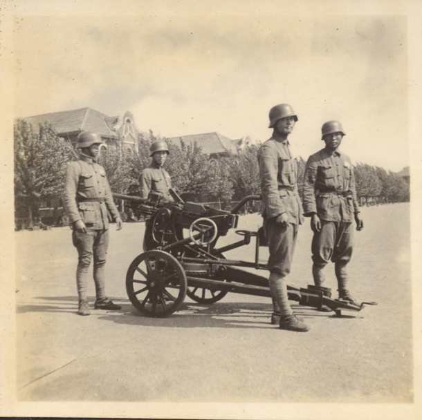 1931年下半年,南京国民政府开始购入苏罗通小炮,先在步兵学校尝试开办训练班。翌年2月,德国军事总顾问佛采尔建议:“中国陆军自购买苏罗通厂良好之二公分口径小炮后,实具防空及步兵战斗之新式兵器,惟翼继续推行耳。每团配属小炮六尊,对变化极多之中国境内战争,成绩必能卓著。”[1]嗣后大量采购,曾在庐山军官训练团演示,留下许多珍贵影像。只见炮架是三脚双轮式,放在三脚炮架射击时能够360度旋转,有效减少后座震动所产生的偏差,缺点是进出阵地颇费周折,需要多人抬运,适合蹲点防空。以轮架射击的话,两个人就能推拉轮子移动,机动性强,适合反制装甲车辆和打击移动、固定目标,不过方向射界只能旋转60度。