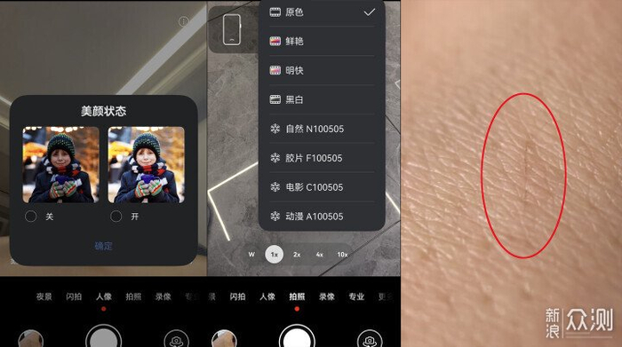 比如上图中,最右侧皮肤的状态和划痕,默认美颜的相机拍完就是光嫩洁白,完全看不到划痕。