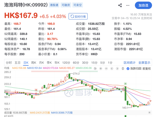 自3月底财报发布后,泡泡玛特股价一路下跌。进入4月,泡泡玛特股价出现明显企稳迹象。4月8日,股价收涨7.62%,报152.6港元,成交额达61.75亿港元。4月14日,泡泡玛特短线拉升,盘中涨超8%,截至发稿,今日股价报167.9港元/股,市值为2251.61亿元,连续两日累计涨超10%。